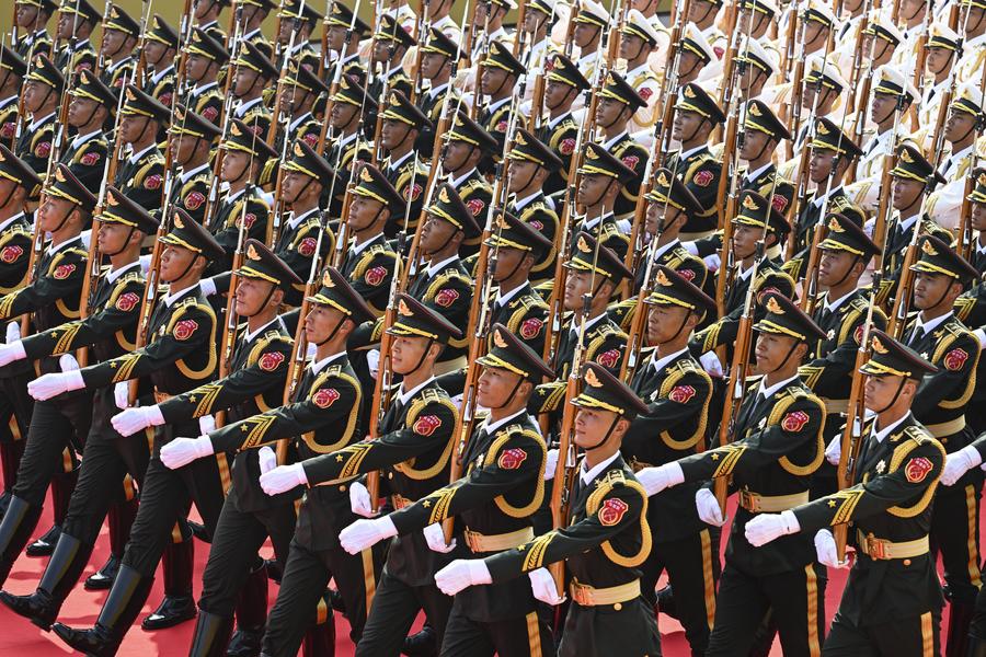 3日、五星紅旗を護衛しながら進む國旗護衛隊の將兵。(北京=新華社記者/胡智軒)