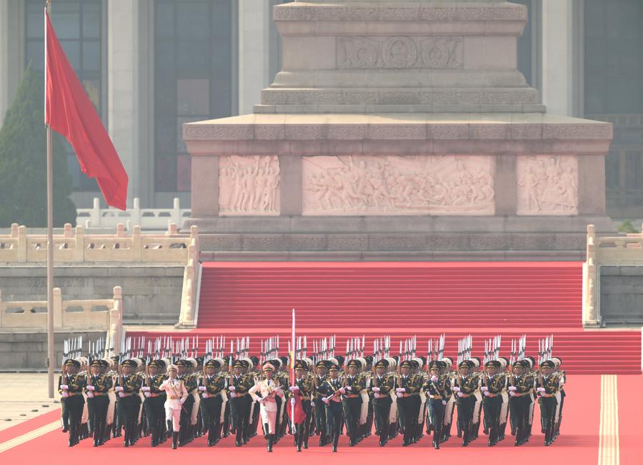 3日、五星紅旗を護衛しながら、天安門広場の人民英雄記念碑から國旗掲揚&へと行進する國旗護衛隊の將兵。(北京=新華社記者/邢広利)