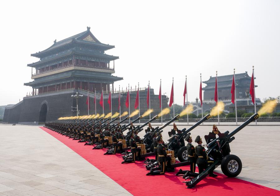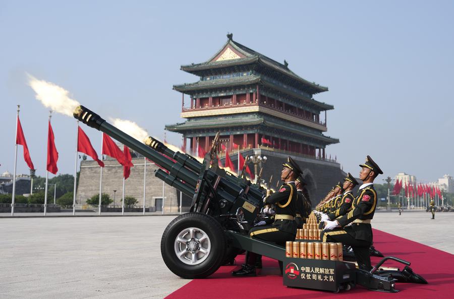 3日、北京市の天安門広場で発射された禮砲。(北京=新華社記者/江文耀)