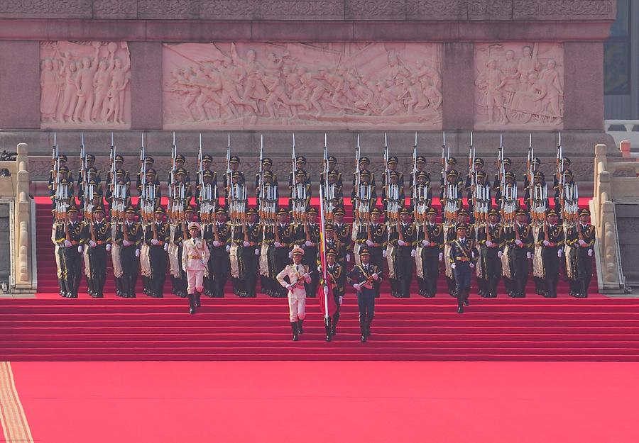 3日、五星紅旗を護衛しながら進む國旗護衛隊の將兵。(北京=新華社記者/費茂華)
