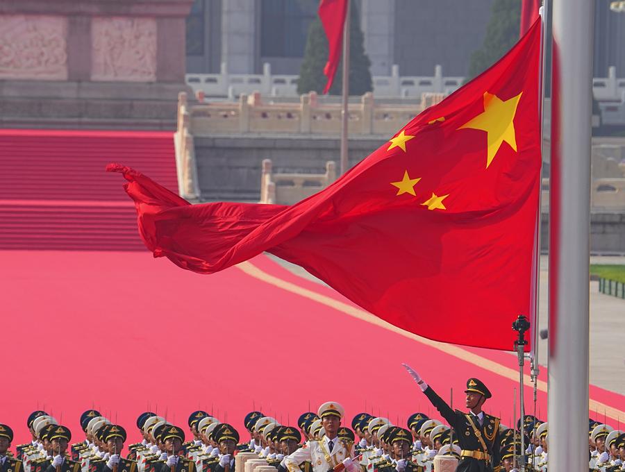 3日、北京市の天安門広場で行われた國旗掲揚式。(北京=新華社記者/張晨)