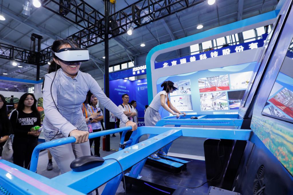 10日、中國國際サービス貿易交易會のスポーツサービス展示エリアでバーチャルスキーを體験する來場者。(北京=新華社記者/常能嘉)