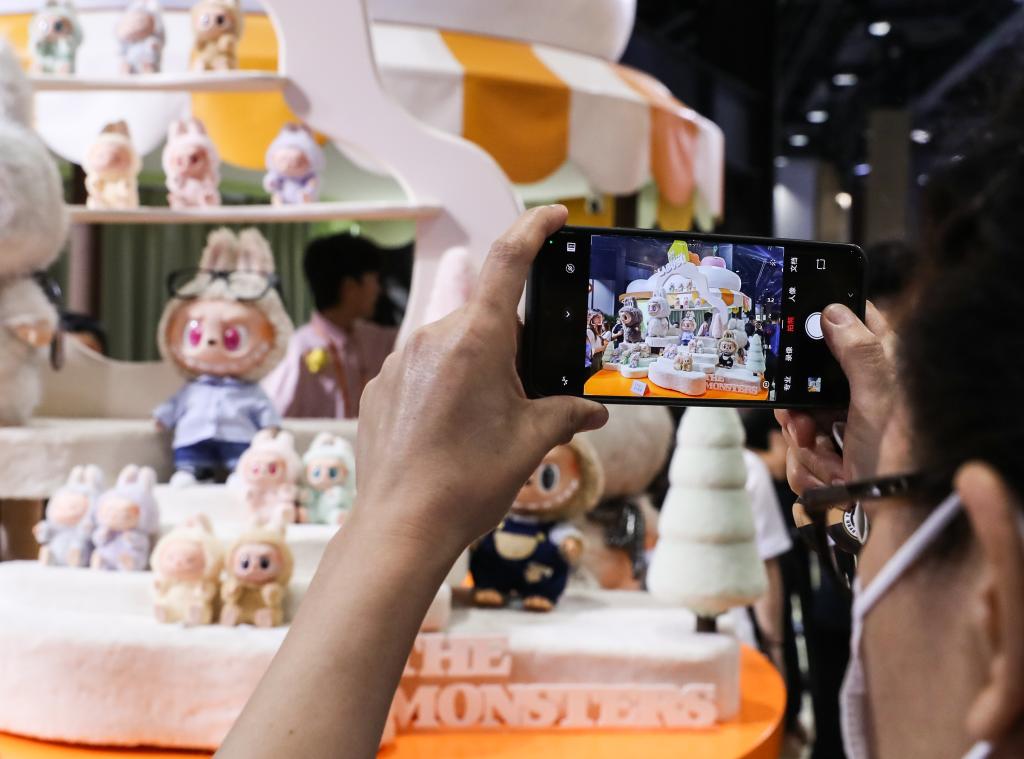 10日、中國國際サービス貿易交易會テーマ展示館に設置されたアートトイブランド「ポップマート」のブースで商品を撮影する來場者。(北京=新華社記者/単宇琦)