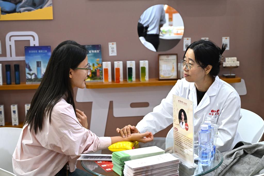10日、中國國際サービス貿易交易會の健康衛生サービス展示エリアで中醫(中國伝統醫學)の問診を受ける來場者(左)。(北京=新華社記者/隋尚君)