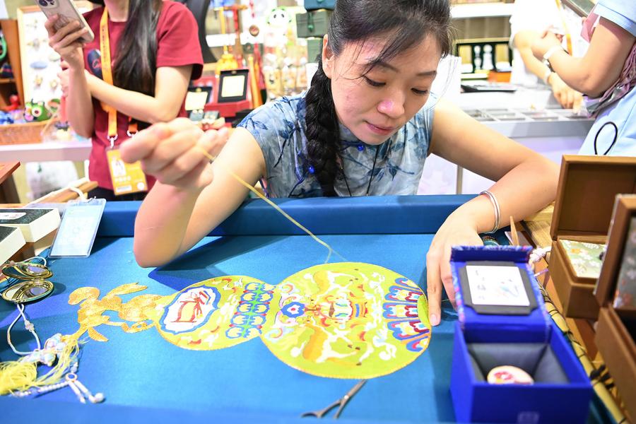 11日、文化・観光サービス展示エリアで伝統刺繍(ししゅう)「京繍」の技を披露する無形文化遺産伝承者の何洪傑(か・こうけつ)さん。(北京=新華社記者/肖瀟)