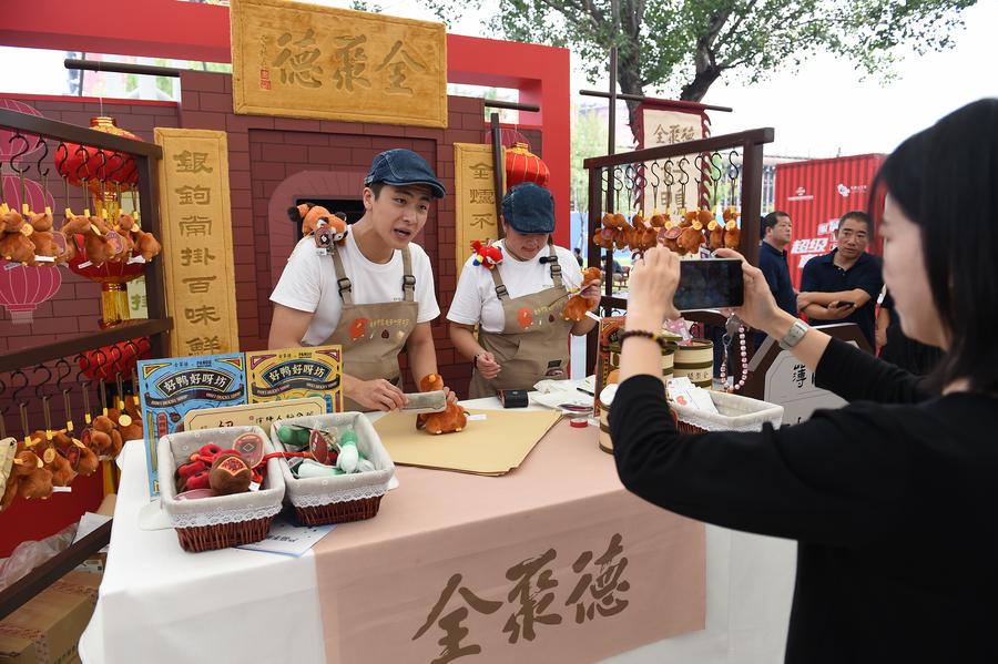 12日、文化・観光サービス展示エリアで、北京ダックの有名店「全聚徳」のグッズを紹介する出展者。(北京=新華社記者/劉嶺逸)