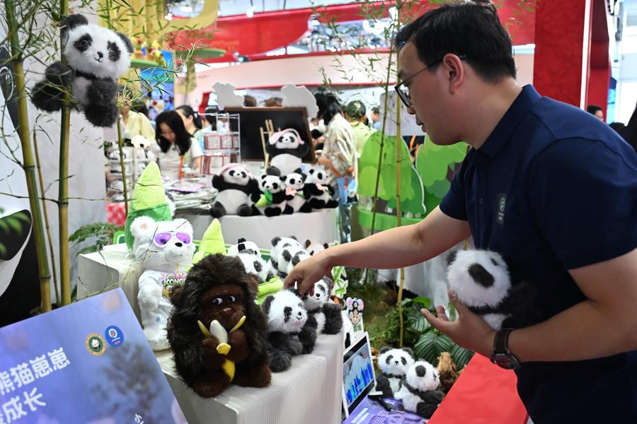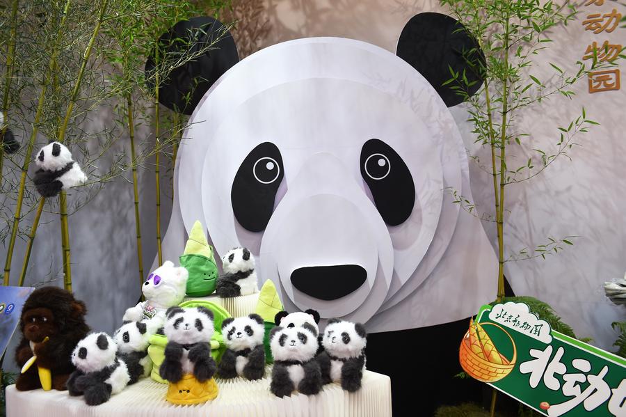 12日、文化・観光サービス展示エリアに並ぶパンダのグッズ。(北京=新華社記者/劉嶺逸)