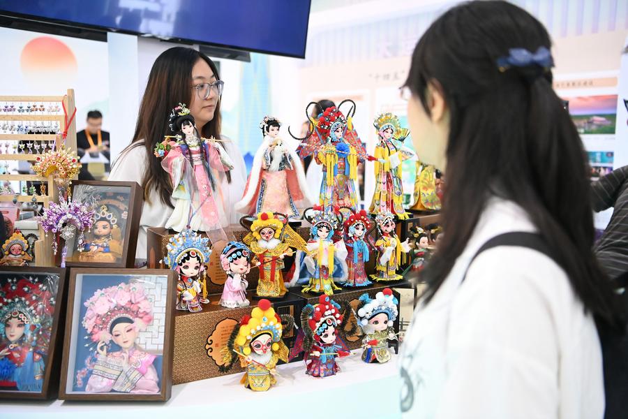 11日、文化・観光サービス展示エリアで國家級無形文化遺産「北京絹人」(絹人形)の作品を鑑賞する來場者。(北京=新華社記者/肖瀟)