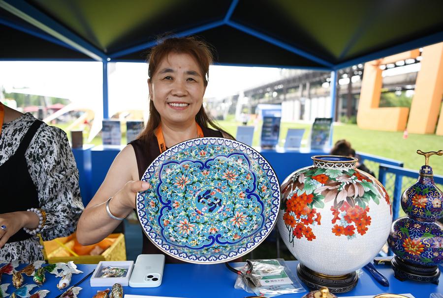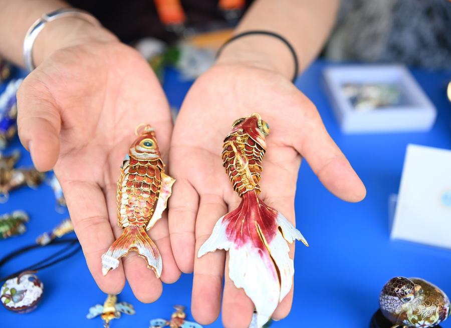 11日、文化・観光サービス展示エリアで景泰藍(七寶焼)の作品を見せる技術伝承者の何愛蓮(か・あいれん)さん。(北京=新華社記者/肖瀟)