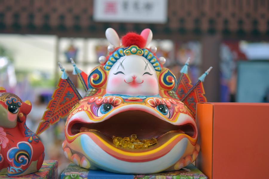 12日、文化・観光サービス展示エリアに出品された北京の伝統的な泥人形「兎児爺」。(北京=新華社記者/張新晶)