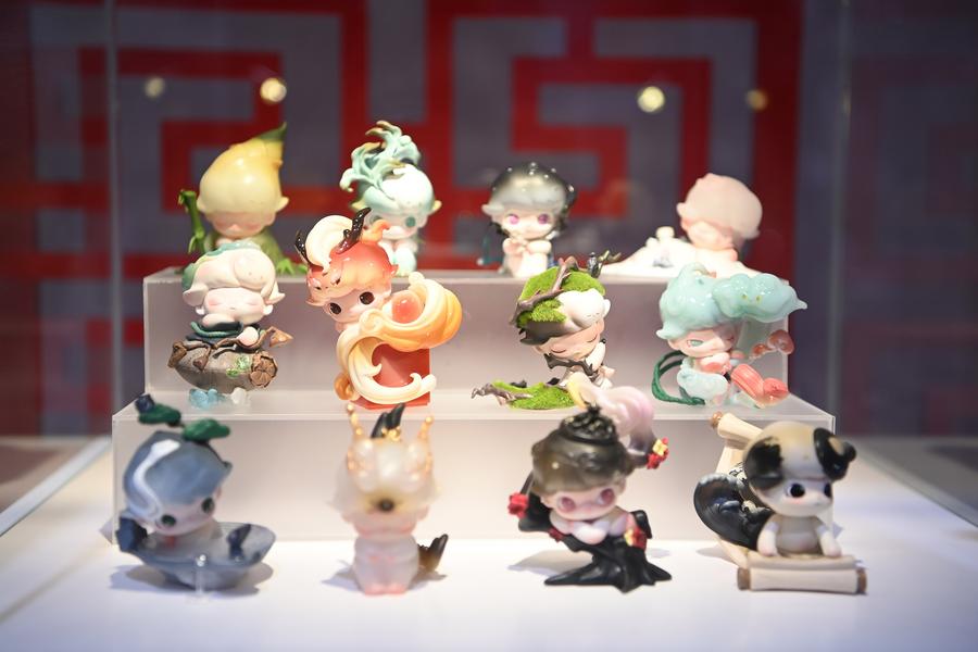 11日、文化・観光サービス展示エリアに並ぶアートトイブランド「ポップマート」の伝統文化シリーズ。(北京=新華社記者/肖瀟)