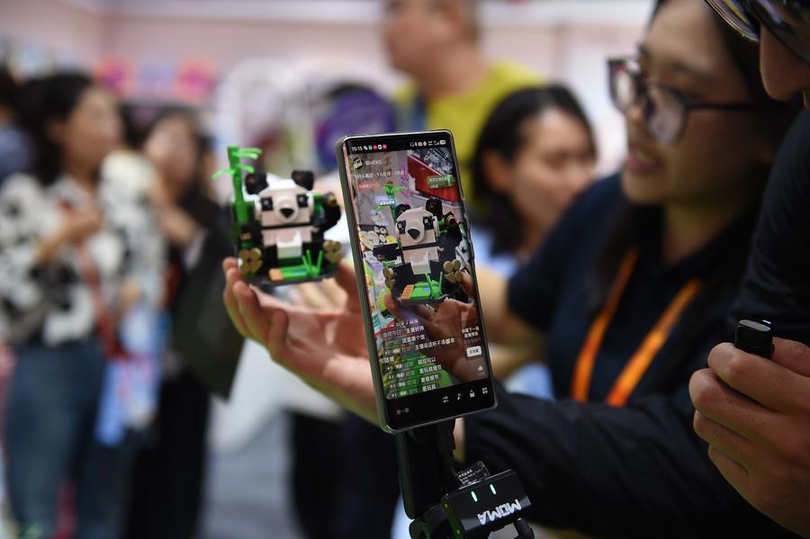 11日、文化・観光サービス展示エリアでライブ配信を通じてパンダのグッズを紹介する來場者。(北京=新華社記者/劉嶺逸)