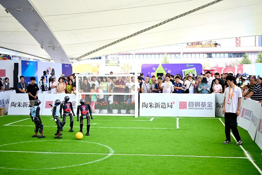 13日、中國國際サービス貿易交易會のスポーツサービス展示エリアでサッカーをする人型ロボット。(北京=新華社記者/陳曄華)
