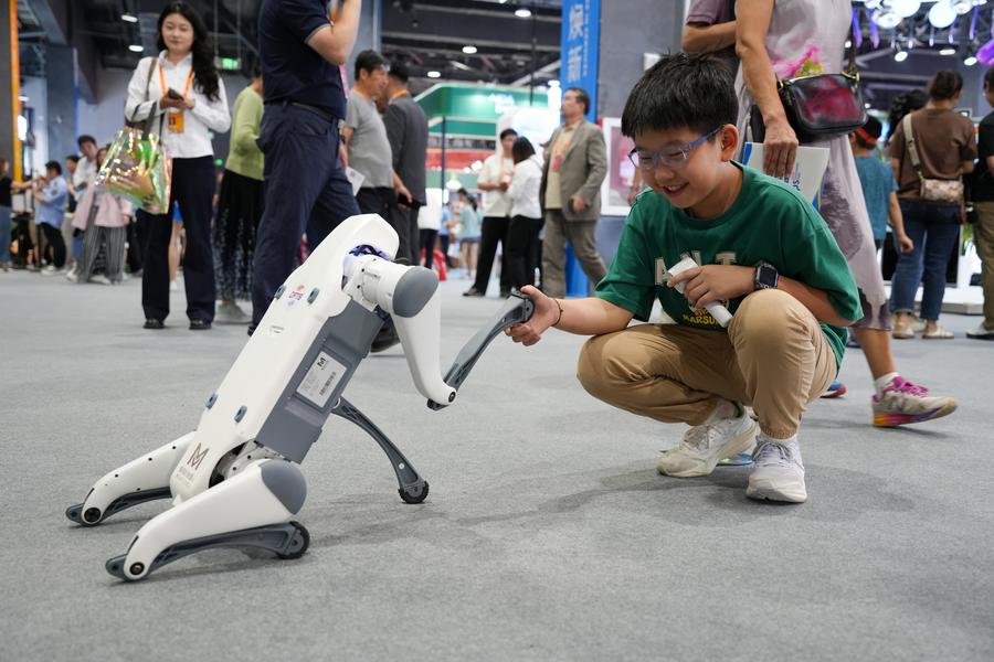 13日、中國國際サービス貿易交易會の會場でロボット犬と握手する子ども。(北京=新華社記者/周汀鷺)