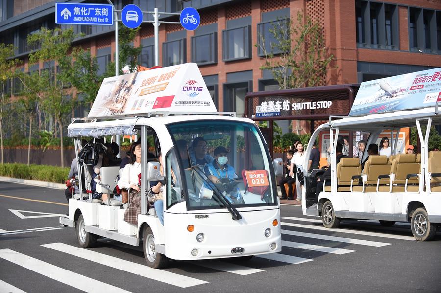 11日、2025年中國國際サービス貿易交易會の會場でシャトルバスを運転して來場者を運ぶスタッフ。(北京=新華社記者/劉嶺逸)