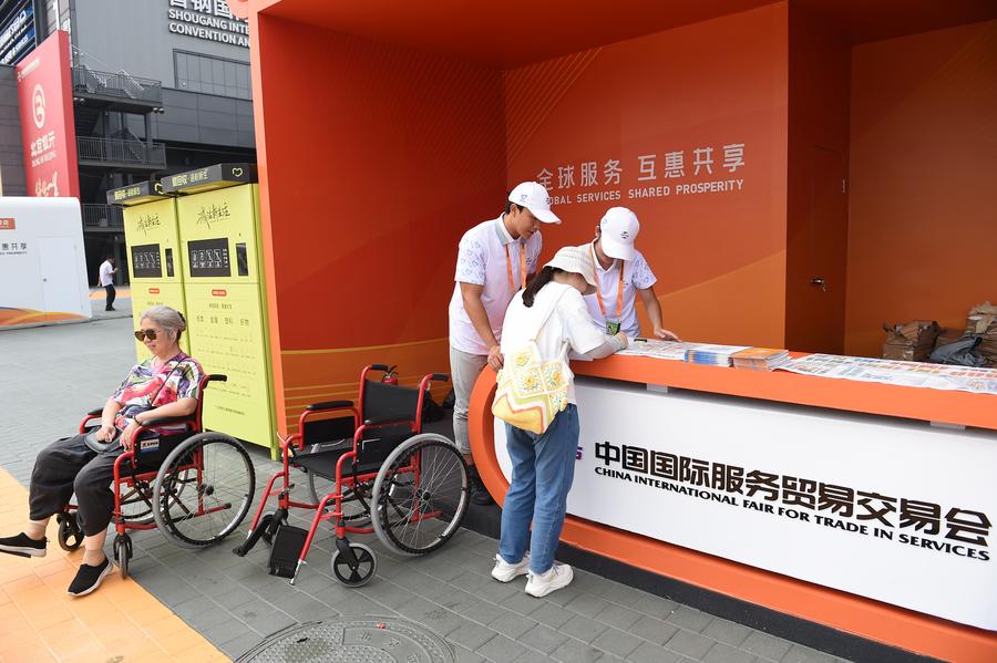 13日、2025年中國國際サービス貿易交易會の會場で來場者に車椅子の貸し出し手続きを行うボランティア。(北京=新華社記者/劉嶺逸)