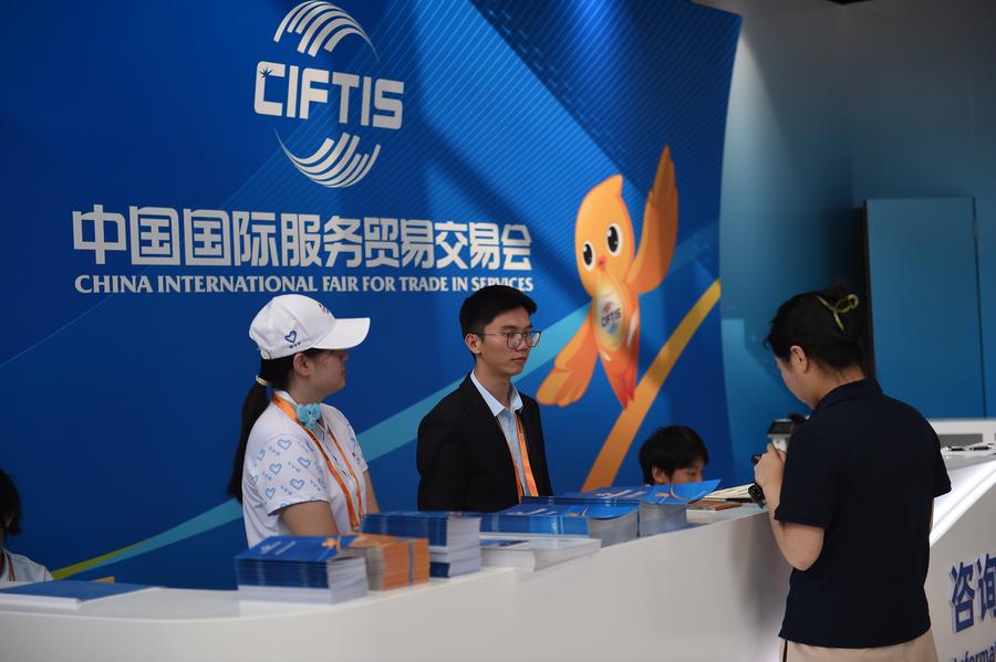 13日、2025年中國國際サービス貿易交易會の會場で來場者の質問に答えるスタッフ。(北京=新華社記者/隋尚君)