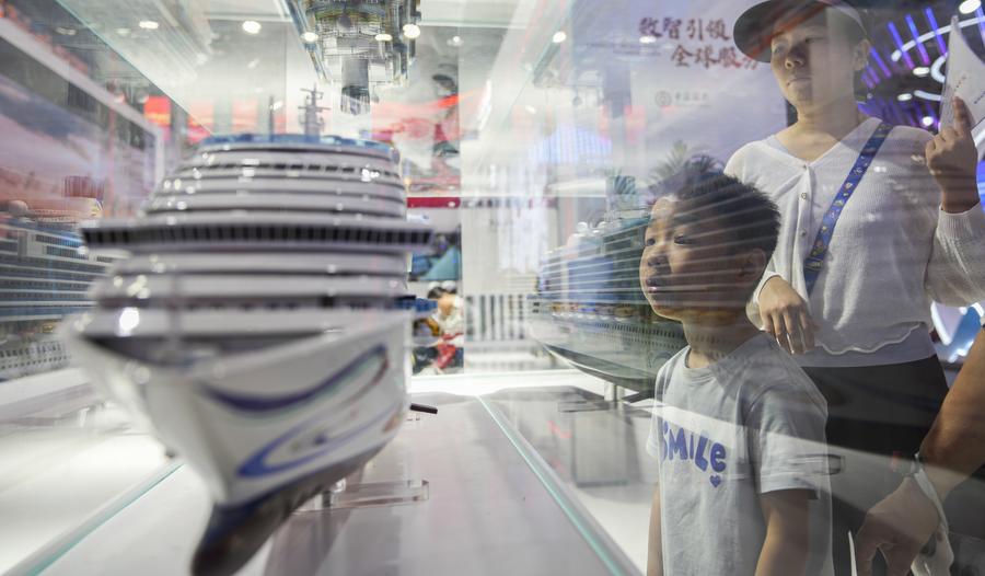 14日、2025年中國國際サービス貿易交易會テーマ展の中國銀行ブースで、クルーズ船の模型を見る子ども。(北京=新華社記者/常能嘉)
