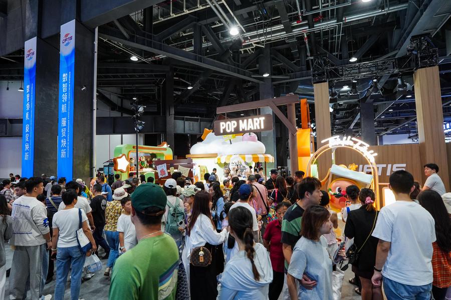 14日、2025年中國國際サービス貿易交易會の會場に設置されたアートトイブランド「ポップマート」の大型オブジェ。(北京=新華社記者/陳曄華)