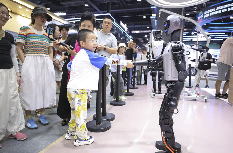 14日、2025年中國國際サービス貿易交易會のテーマ展で、人型ロボットと觸れ合う子ども。(北京=新華社記者/鄒多為)
