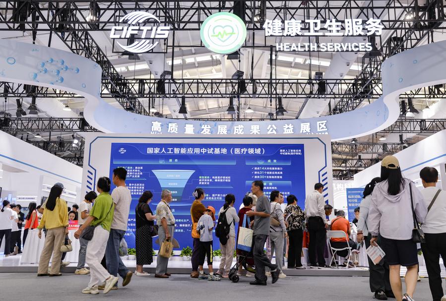 14日、2025年中國國際サービス貿易交易會のテーマ展を訪れた人たち。(北京=新華社記者/陳曄華)