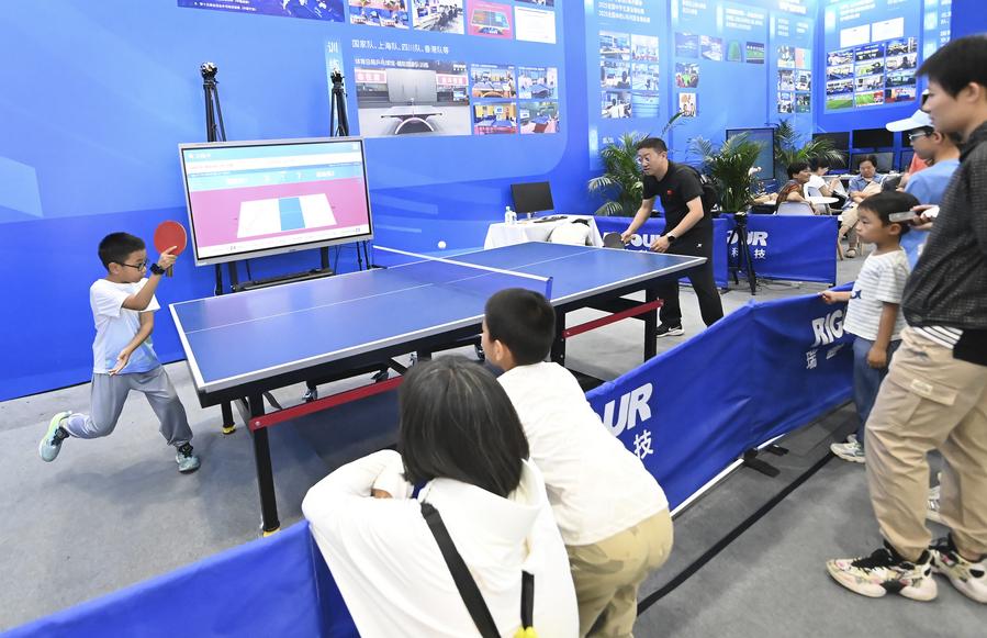 14日、2025年中國國際サービス貿易交易會のスポーツサービス展示エリアで、スマート卓球システムを體験する人たち。(北京=新華社記者/肖瀟)