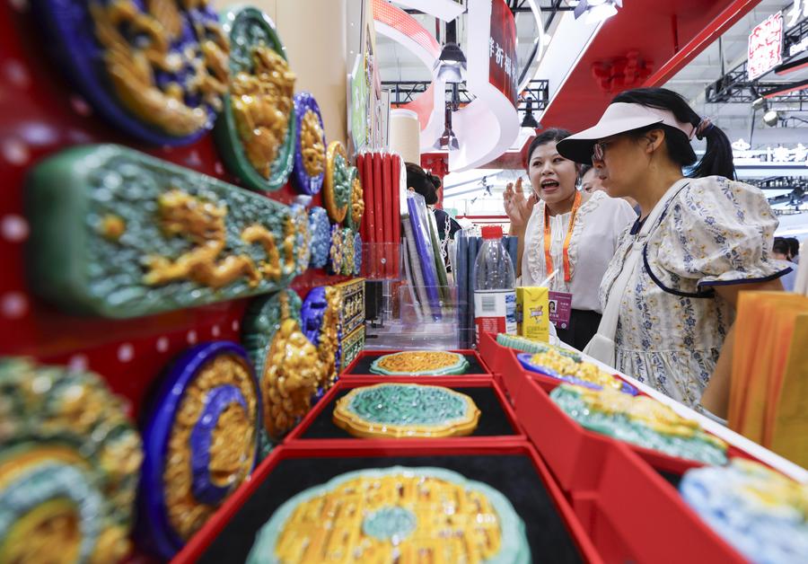 14日、2025年中國國際サービス貿易交易會文化観光サービス展示エリアの北京市門頭溝區ブースで、文化クリエーティブ製品を選ぶ人たち。(北京=新華社記者/常能嘉)