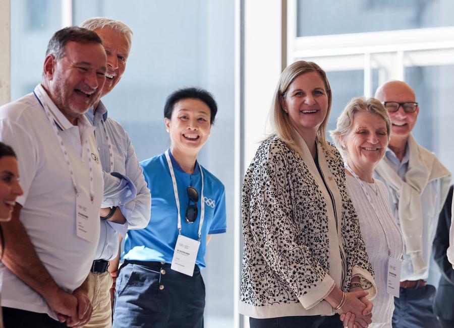 18日、選手村を視察し、記念撮影するIOCのカースティ・コベントリー會長。(ミラノ=新華社記者/李京)