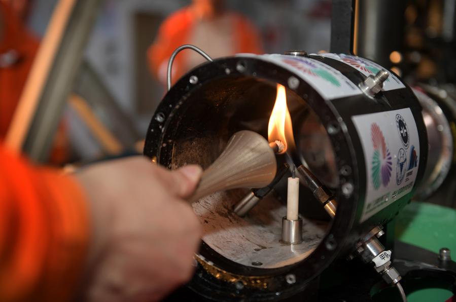 科學調查船の甲板で、種火を専用容器へと移す広州海洋地質調查局の沙志彬(さ・しひん)副総工程師(左)。種火採取チームのサブリーダーを務めた。(9月18日撮影、広州=新華社記者/盧漢欣)