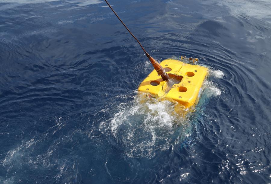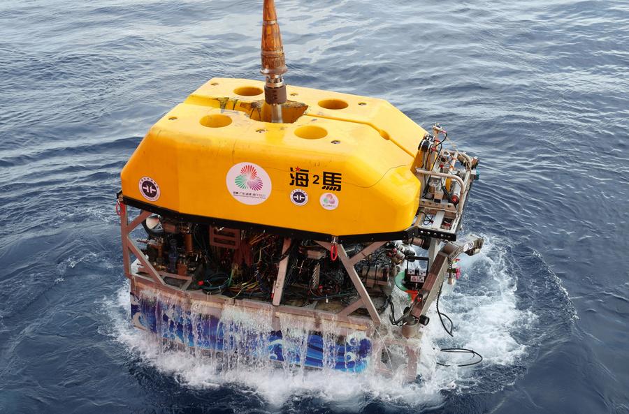 深海底での種火採取後、海水面に浮上した遠隔操作無人潛水機「海馬」。(9月18日撮影、広州=新華社記者/盧漢欣)