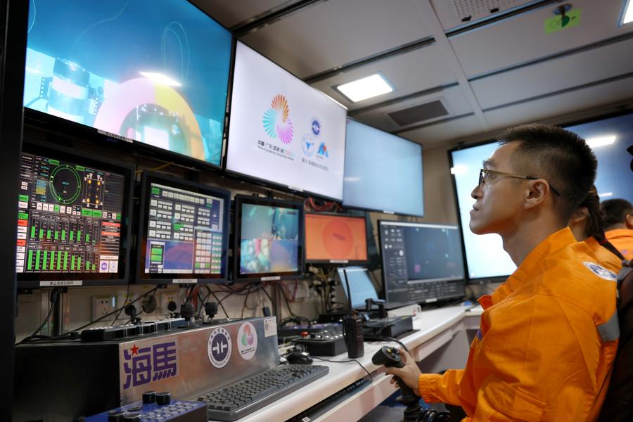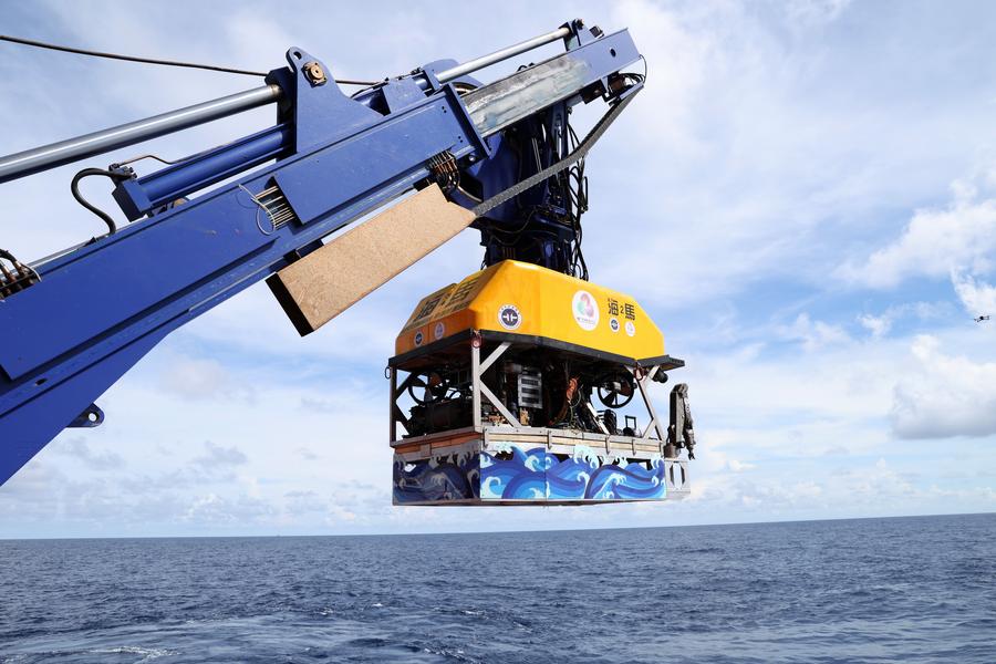 種火採取のために潛航準備を整える遠隔操作無人潛水機「海馬」。(9月18日撮影、広州=新華社記者/盧漢欣)