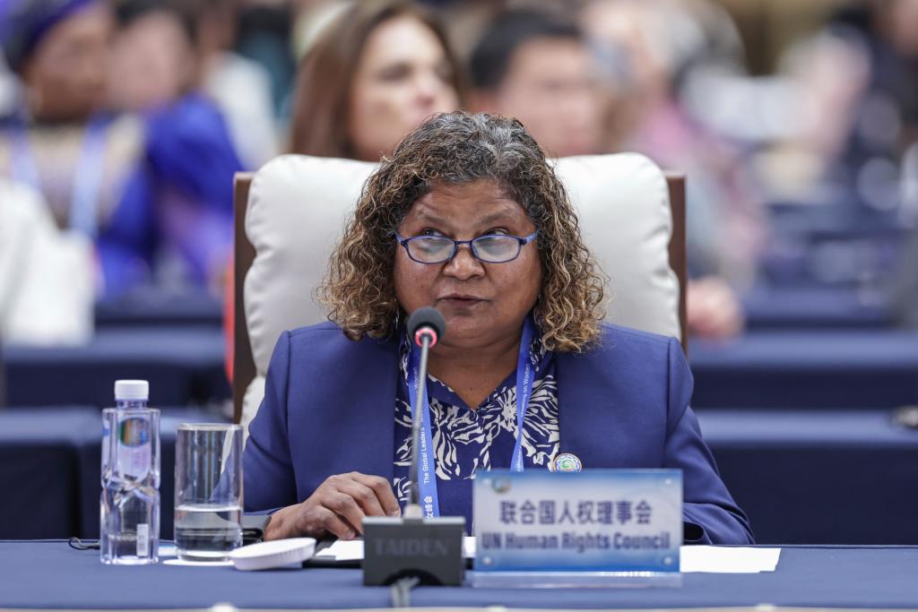 13日、世界女性サミットの全體會議であいさつする國連人権理事會の代表。(北京=新華社記者/張玉薇)