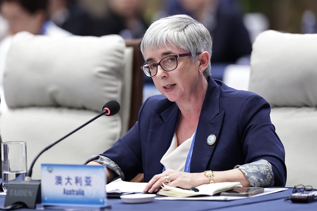 13日、世界女性サミットの全體會議であいさつするオーストラリアの代表。(北京=新華社記者/張玉薇)