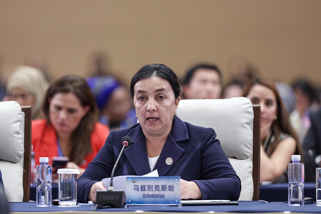 13日、世界女性サミットの全體會議であいさつするウズベキスタンの代表。(北京=新華社記者/張玉薇)