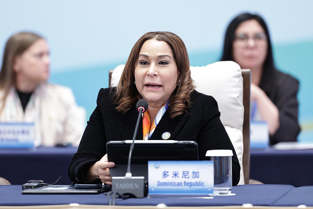 13日、世界女性サミットの全體會議であいさつするドミニカの代表。(北京=新華社記者/張玉薇)