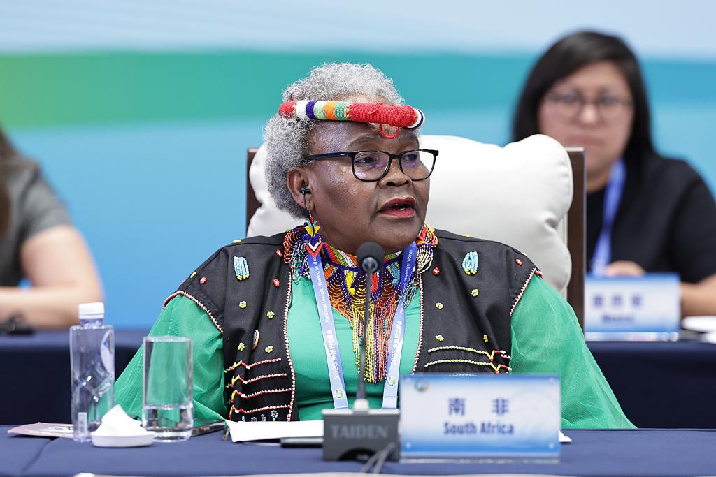 13日、世界女性サミットの全體會議であいさつする南アフリカの代表。(北京=新華社記者/張玉薇)