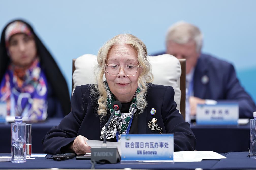 13日、世界女性サミットの全體會議であいさつする國連ジュネーブ事務局の代表。(北京=新華社記者/張玉薇)