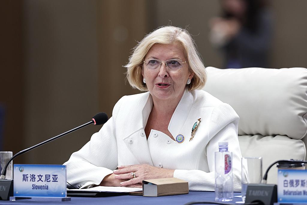 13日、世界女性サミットの全體會議であいさつするスロベニアの代表。(北京=新華社記者/張玉薇)