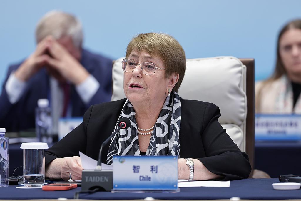 13日、世界女性サミットの全體會議であいさつするチリの代表。(北京=新華社記者/張玉薇)