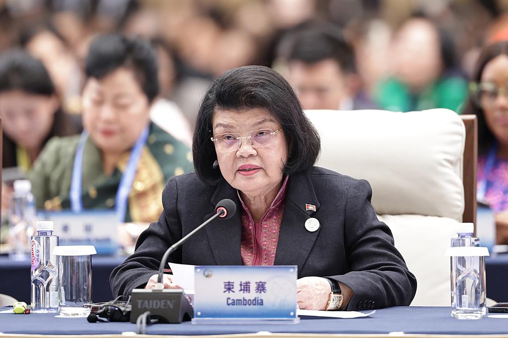13日、世界女性サミットの全體會議であいさつするカンボジアの代表。(北京=新華社記者/張玉薇)