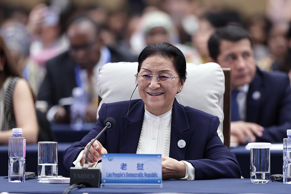 13日、世界女性サミットの全體會議であいさつするラオスの代表。(北京=新華社記者/張玉薇)