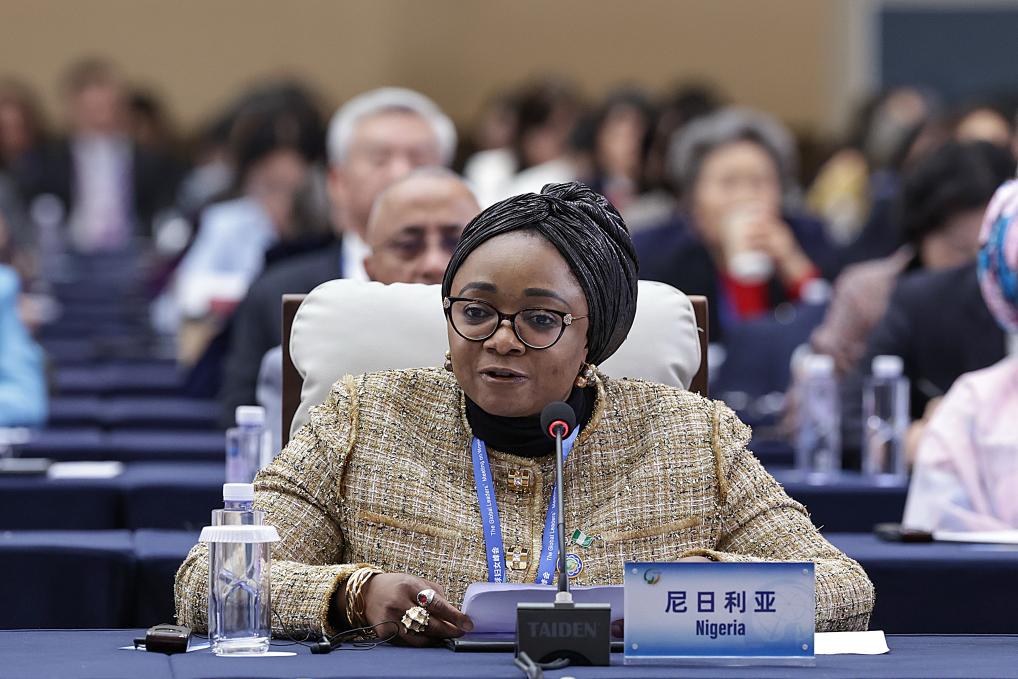 13日、世界女性サミットの全體會議であいさつするナイジェリアの代表。(北京=新華社記者/張玉薇)