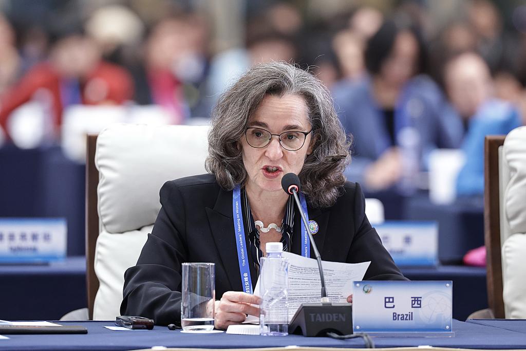 13日、世界女性サミットの全體會議であいさつするブラジルの代表。(北京=新華社記者/張玉薇)
