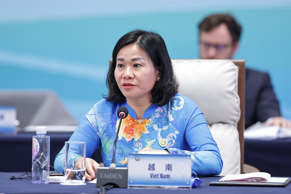 13日、世界女性サミットの全體會議であいさつするベトナムの代表。(北京=新華社記者/張玉薇)