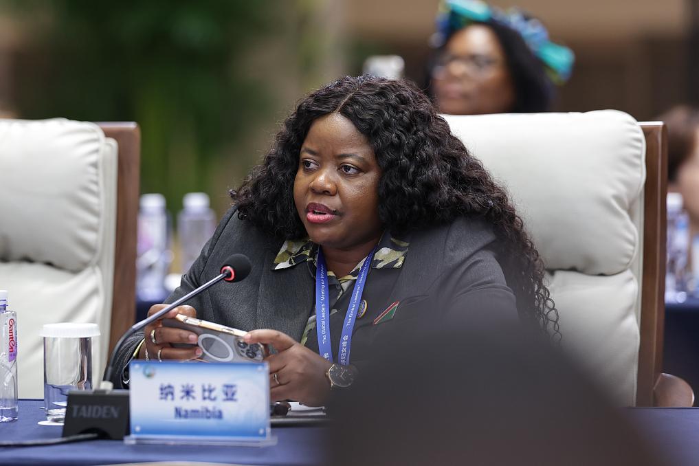 13日、世界女性サミットの全體會議であいさつするナミビアの代表。(北京=新華社記者/張玉薇)