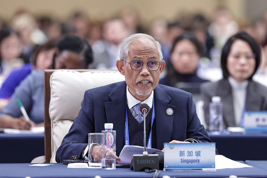 13日、世界女性サミットの全體會議であいさつするシンガポールの代表。(北京=新華社記者/張玉薇)