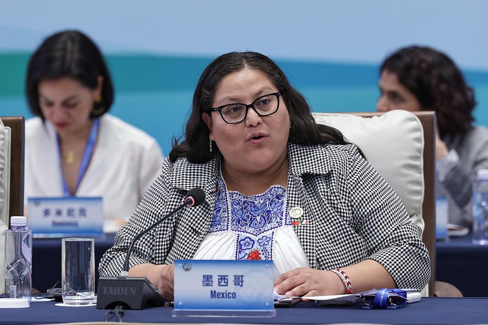 13日、世界女性サミットの全體會議であいさつするメキシコの代表。(北京=新華社記者/張玉薇)