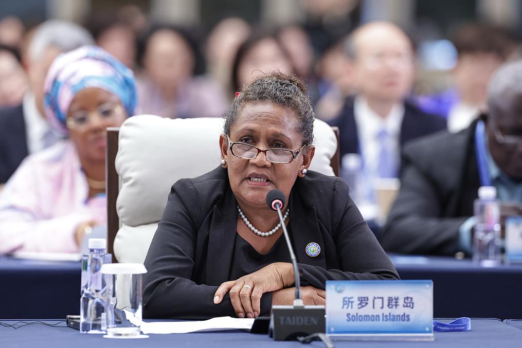 13日、世界女性サミットの全體會議であいさつするソロモン諸島の代表。(北京=新華社記者/張玉薇)