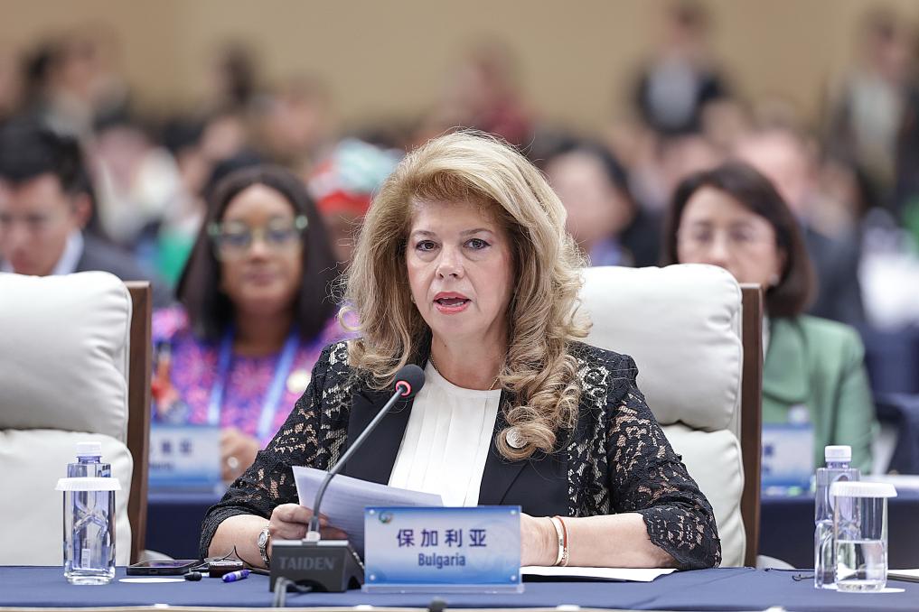 13日、世界女性サミットの全體會議であいさつするブルガリアの代表。(北京=新華社記者/張玉薇)