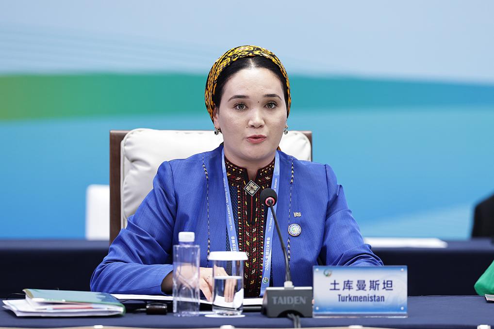 13日、世界女性サミットの全體會議であいさつするトルクメニスタンの代表。(北京=新華社記者/張玉薇)